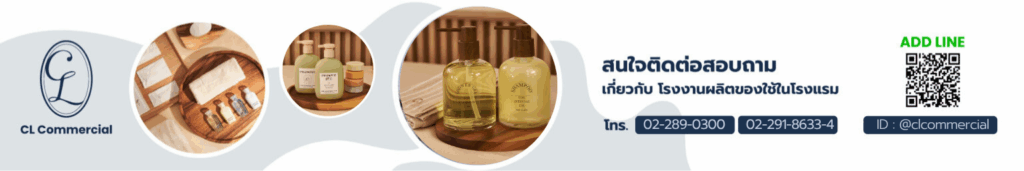และหากท่านใดอยากจะผลิตของใช้ในโรงแรมหรือกำลังมองหาโรงงานผลิตของใช้ในโรงแรม ปรึกษาเราได้เลยนะคะ โรงงานผลิตของใช้ในโรงแรม CL Commercials ยินดีให้บริการและให้คำแนะนำเกี่ยวกับการผลิตของใช้ในโรงแรม เราเป็นโรงงานผลิตของใช้ในโรงแรมที่มีประสบการณ์ยาวนานมากกว่า 30 ปี มีทีมงานที่เป็นมืออาชีพในทุกฝ่ายให้คำปรึกษาตั้งแต่เริ่มออกแบบของใช้ในโรงแรมไปจนให้คำปรึกษาหลังการขาย มีของใช้ในโรงแรมให้เลือกผลิตแบบครบวงจร ไม่ว่าจะเป็นของใช้ในโรงแรม ของใช้ในห้องน้ำ ของใช้ในโรงพยาบาล และอุปกรณ์ทำความสะอาดต่าง ๆ และมีบริการผลิตสบู่ OEM ที่สามารถเลือกสูตร สี กลิ่น แพคเก็จและตีแบรนด์เป็นของตัวเอง ทั้งของใช้ในโรงแรมและสบู่ หากสั่งผลิตเป็นจำนวนมากก็จะยิ่งได้ราคาพิเศษ คุณจะได้ของใช้ในโรงแรมที่มีคุณภาพดีแต่ราคาโรงงานจากโรงงานผลิตของใช้ในโรงแรม CL Commercials อย่างแน่นอนค่ะ