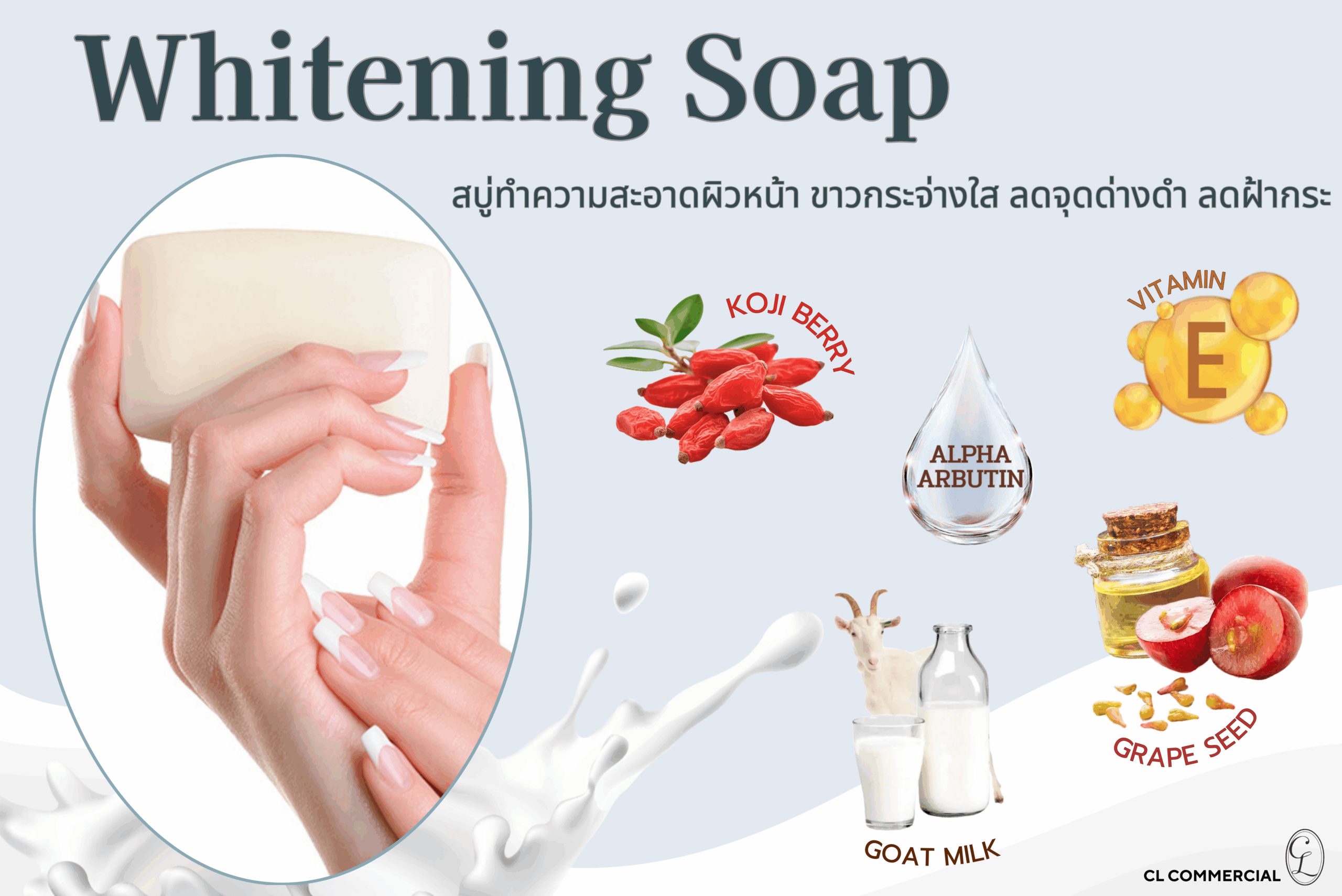 ประกอบไปด้วย Alpha Arbutin, Koji berry, Grape seed, Vitamin E และ Goat Milk